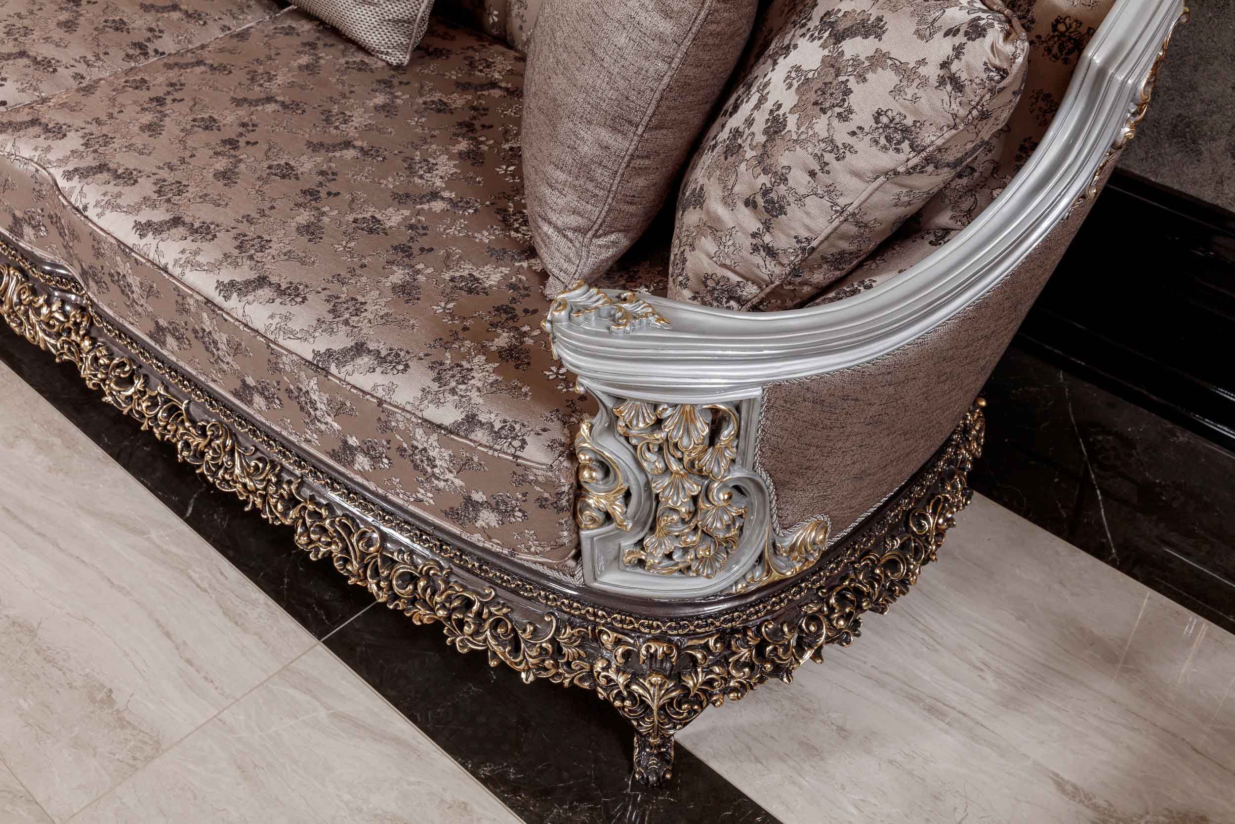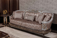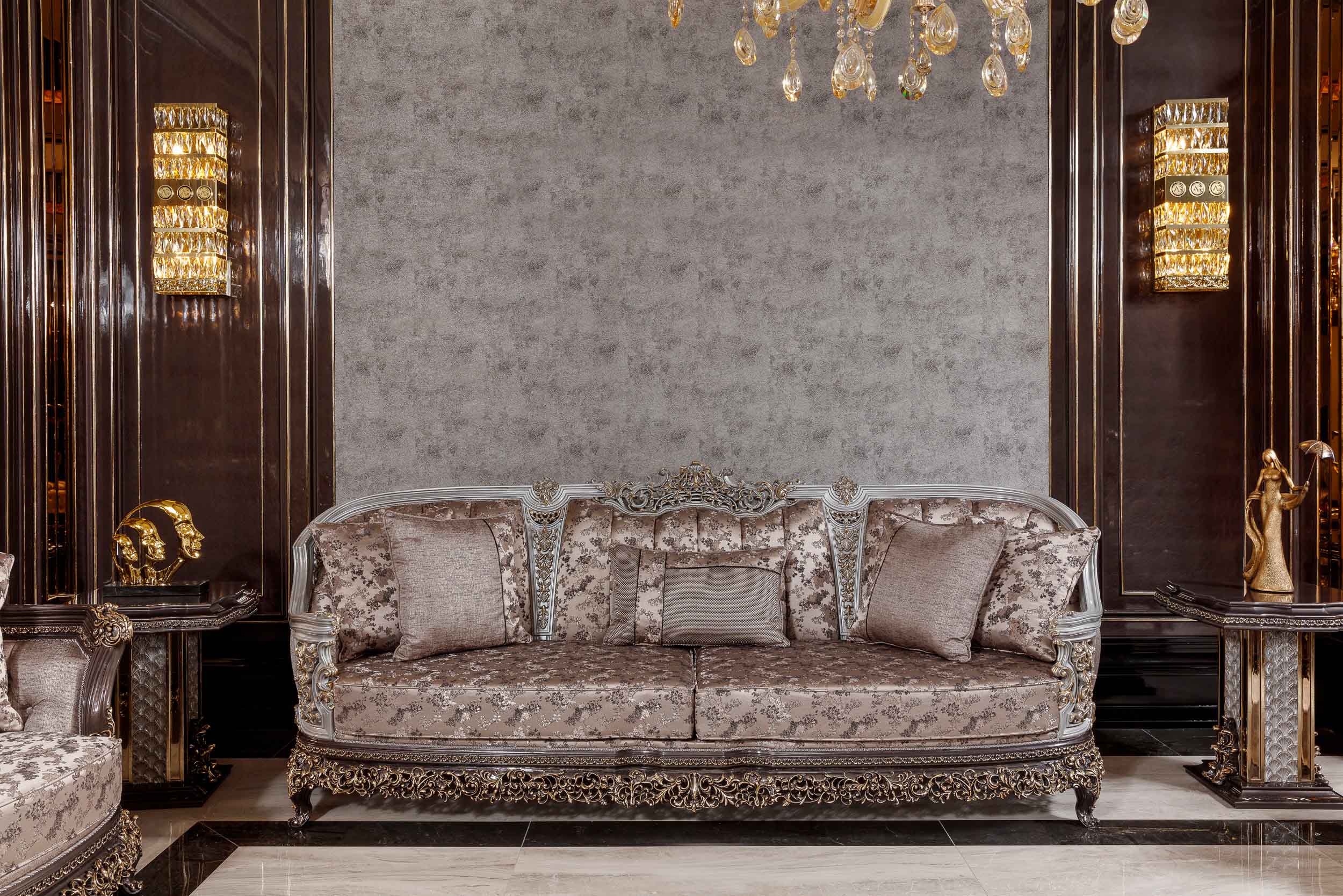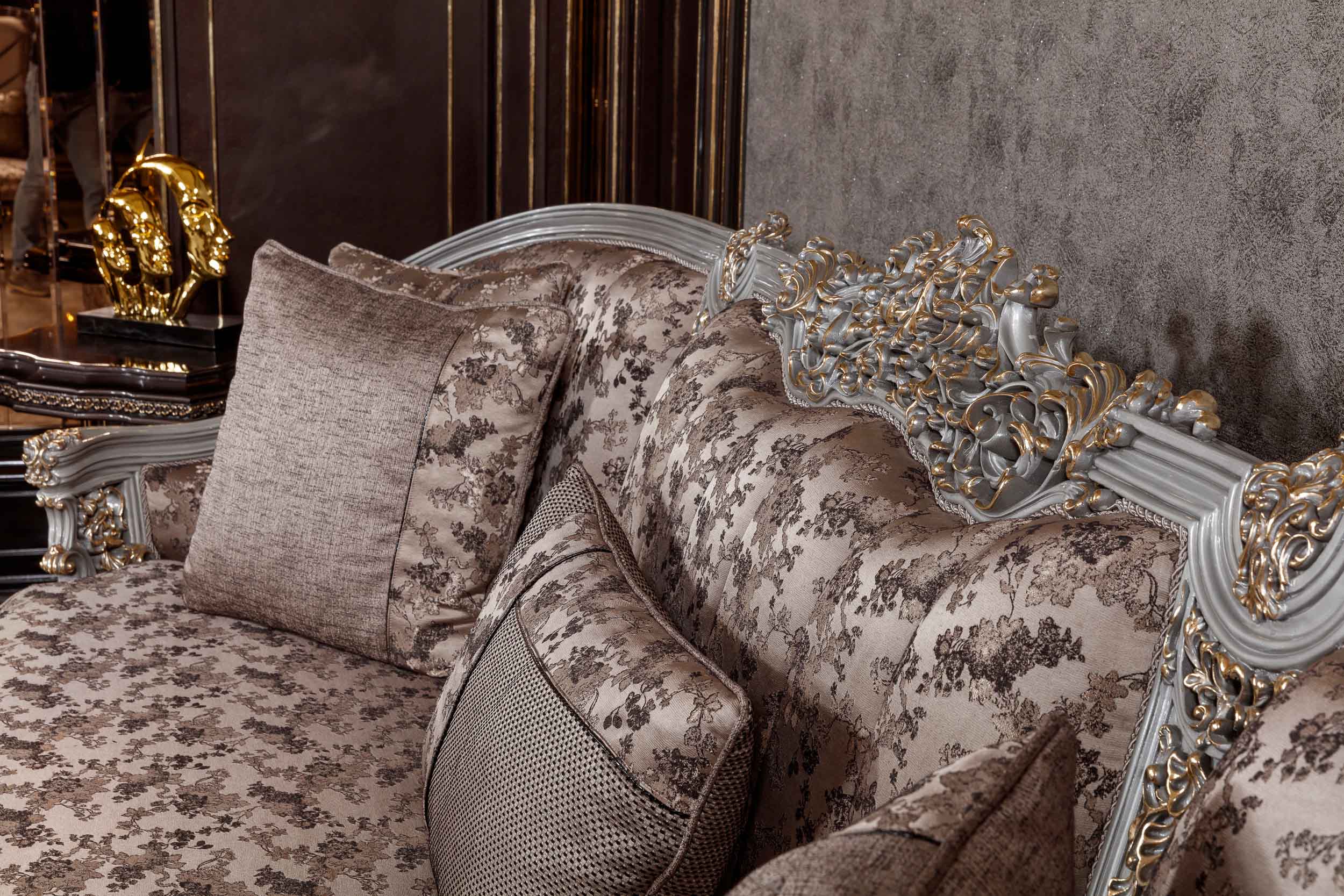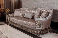 The Sirius Couch brings timeless elegance to any living room with its classically inspired design and intricate carved wooden details. Upholstered in a sophisticated gray patterned fabric, this piece combines traditional craftsmanship with refined aesthetics. The carved accents frame the silhouette beautifully, adding architectural interest and depth. Perfect for those who appreciate enduring design and quality construction, the Sirius delivers both comfort and visual distinction—a statement piece that anchors a curated interior.