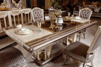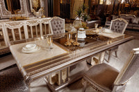 Diseñada pensando en el lujo y el diseño clásico, la mesa de comedor Vitale agrega un toque de elegancia a cualquier espacio de comedor. El intrincado tallado y los detalles en pan de oro demuestran la artesanía experta, lo que la convierte en una pieza atemporal que seguramente impresionará. Eleve su experiencia gastronómica con esta impresionante mesa.