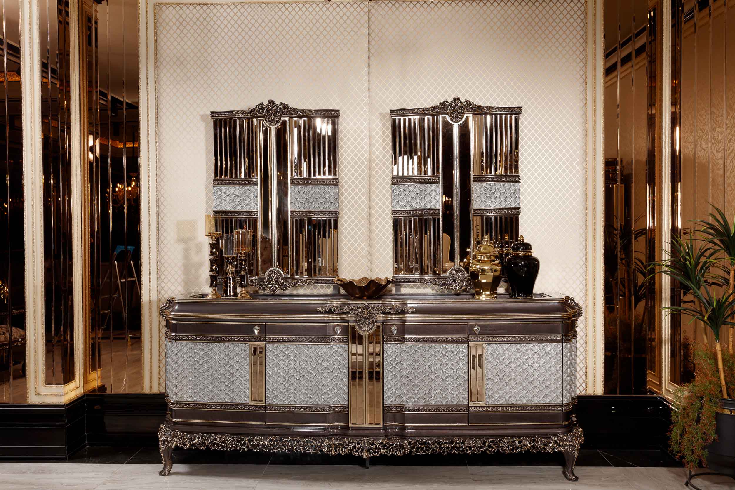 The Sirius Sideboard brings timeless elegance to your dining room with its classic four-door design and intricate hand-carved details. Each door features refined carvings that add architectural interest and visual depth, making this piece a sophisticated focal point for storage and display. Crafted with premium materials and meticulous attention to detail, the Sirius combines traditional craftsmanship with enduring style—ideal for those who appreciate curated, statement-making furniture that transcends trends.
